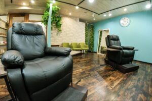 黒い椅子と焦茶色のフロアカラーで落ち着いた店内となっております。